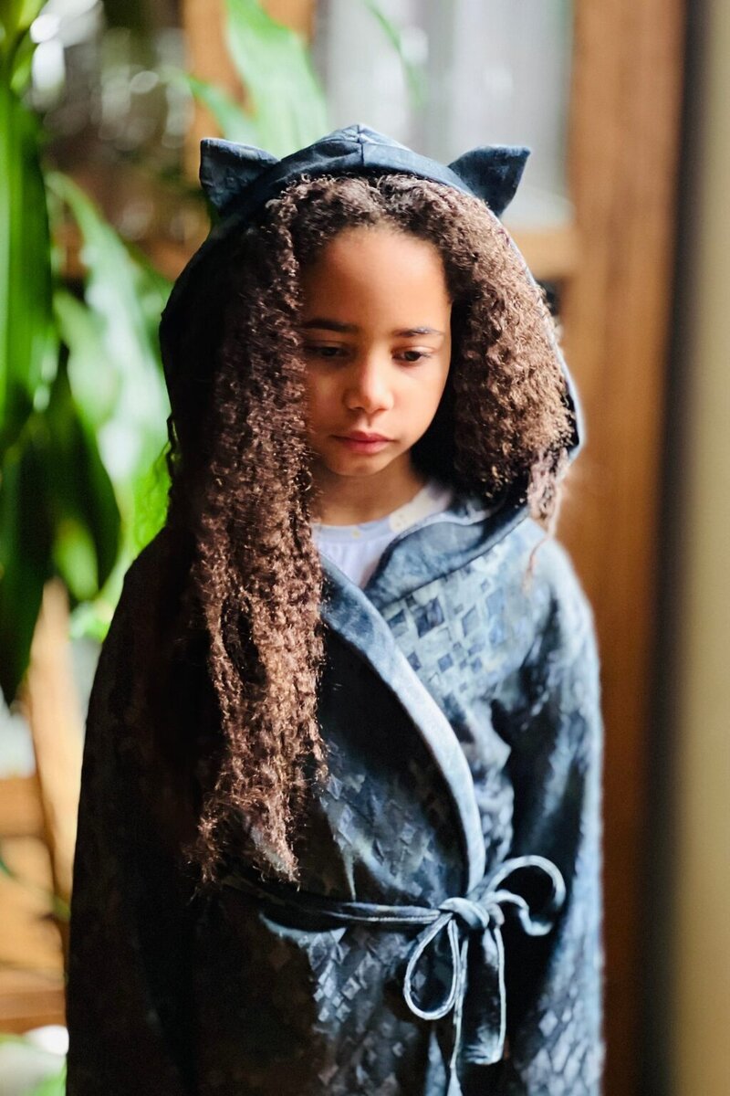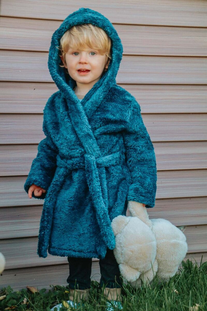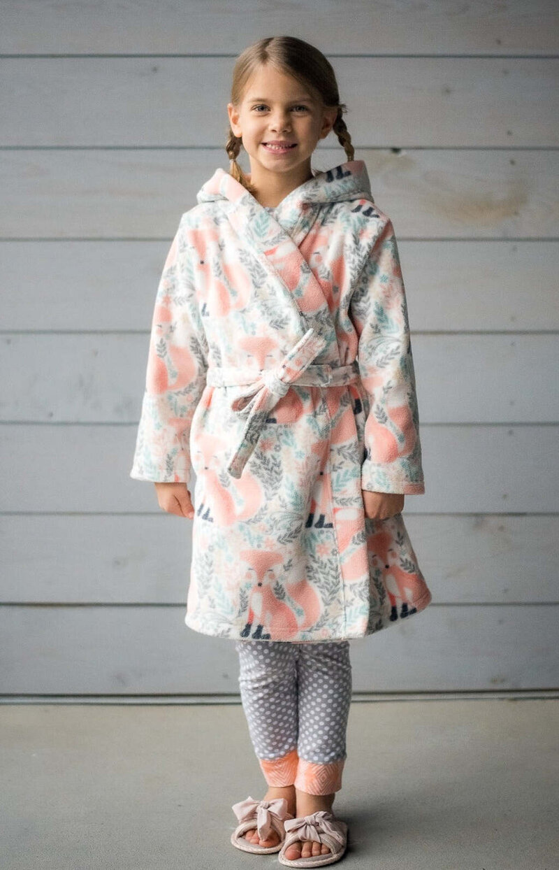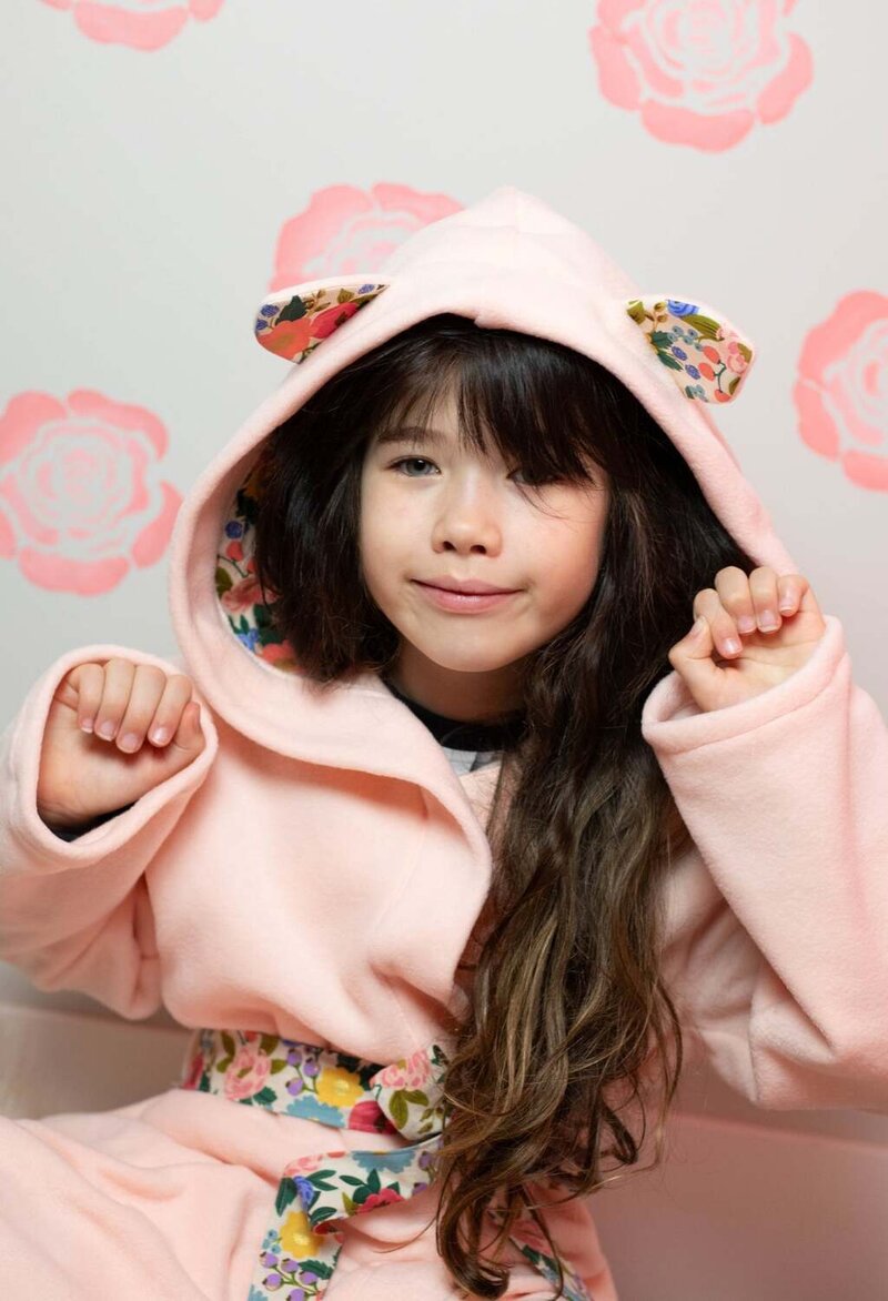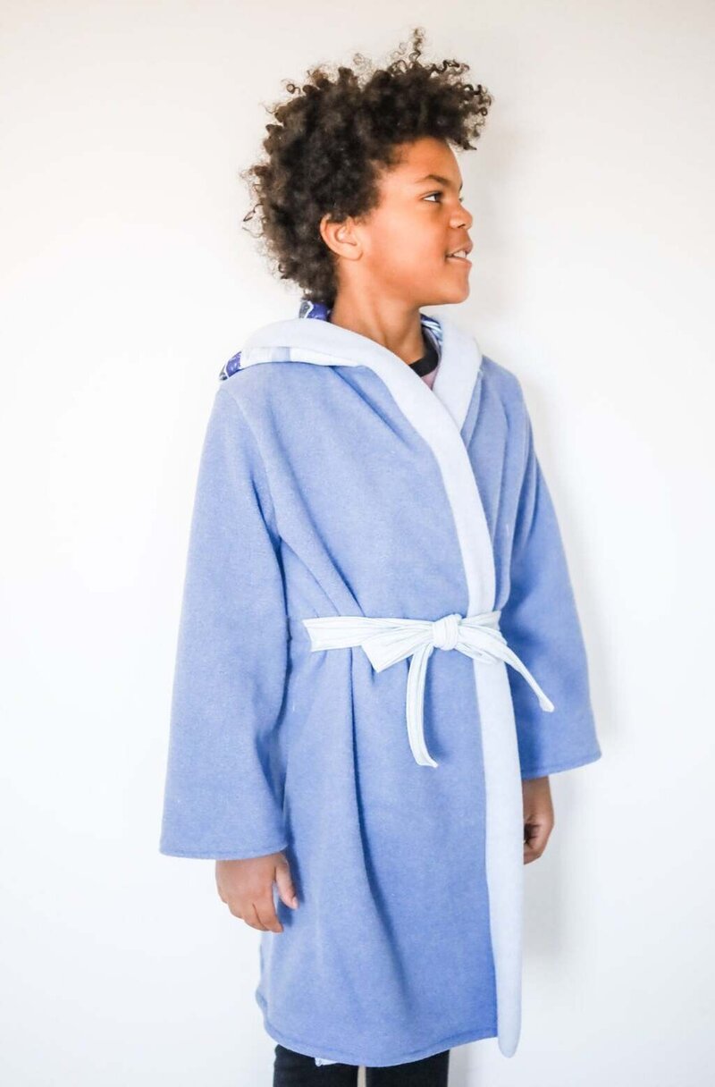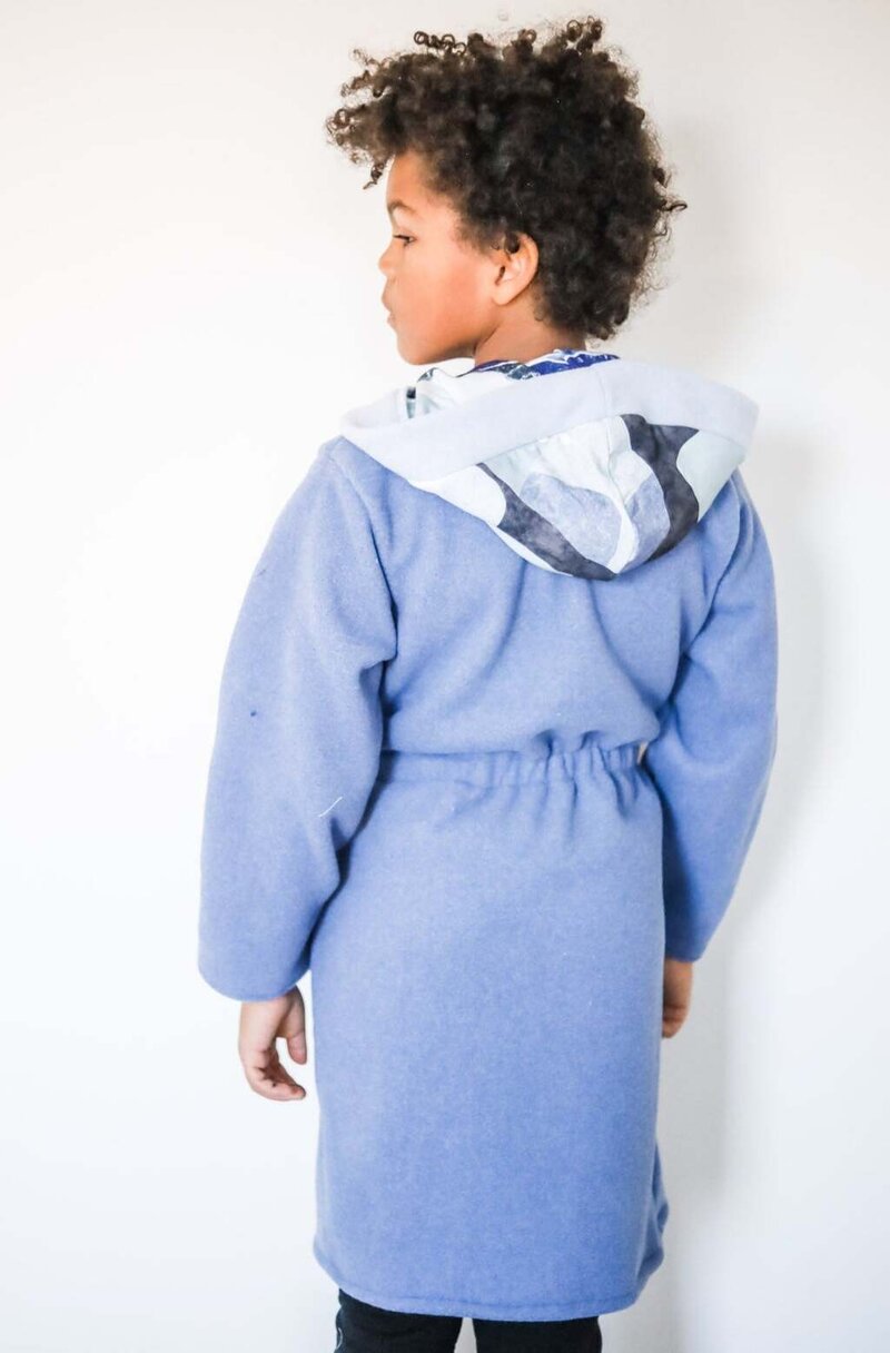 Cocoa is a cuddly, hooded robe designed for woven or knit fabrics with an elasticated back waist and sewn in ties. Add some ears to the hood for a fun look!