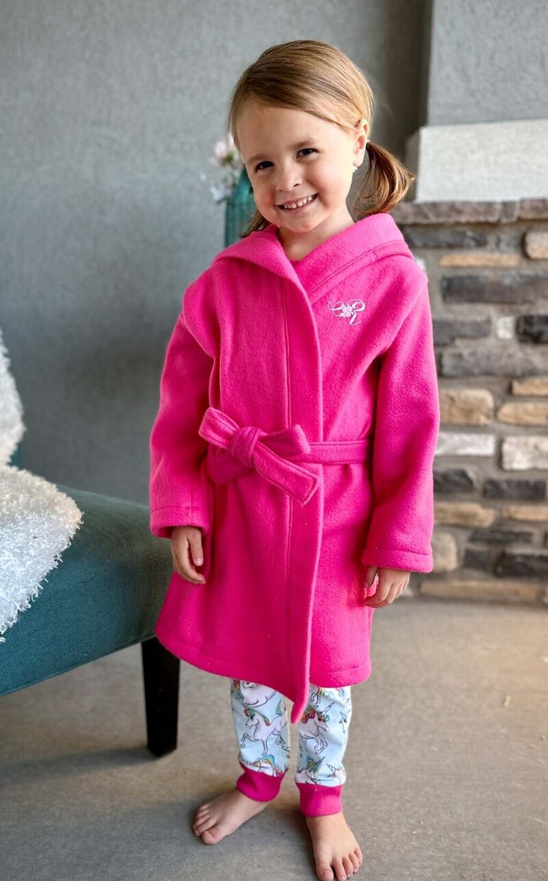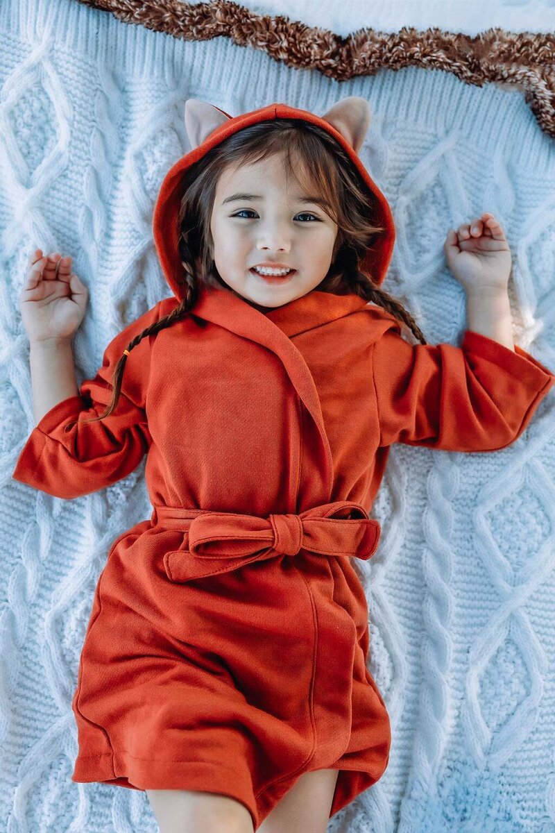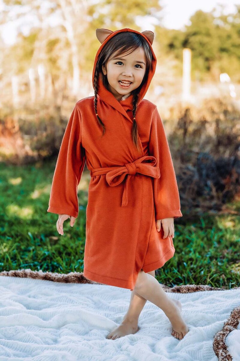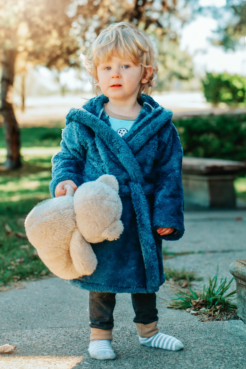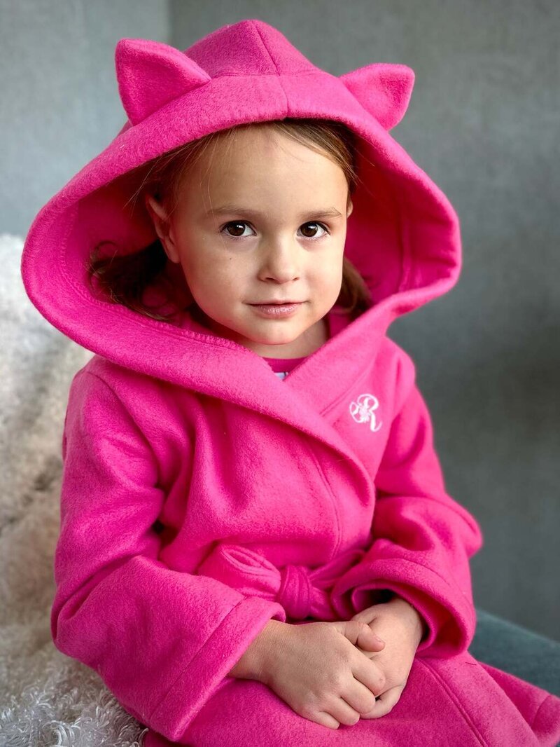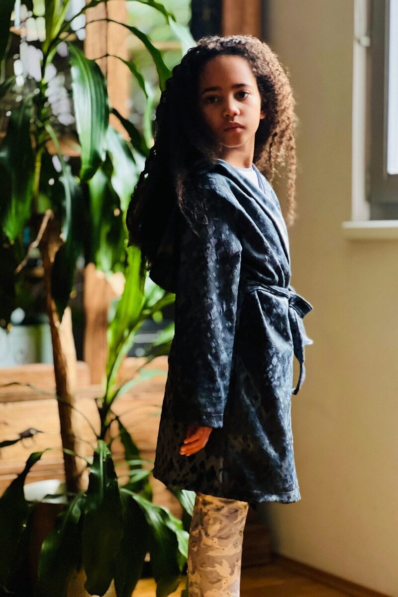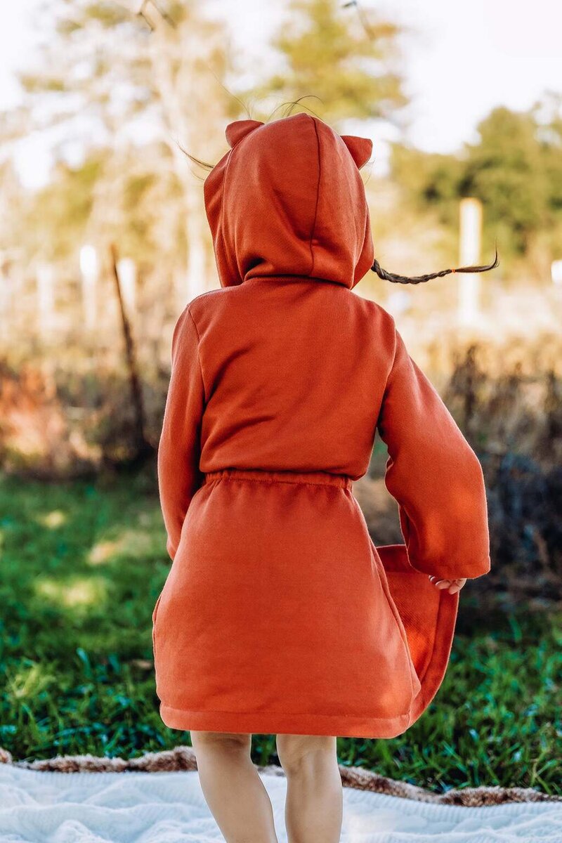 Cocoa is a cuddly, hooded robe designed for woven or knit fabrics with an elasticated back waist and sewn in ties. Add some ears to the hood for a fun look!
