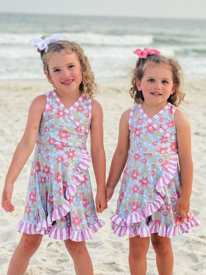 Vetiver is a sweet knit dress featuring a crossover bodice that can be made either sleeveless or with the option for gorgeous long or short elasticated sleeves. The skirt includes options for a simple vintage length half circle skirt, a half circle skirt with a ruffle hem finish or a crossover half circle skirt with a ruffle hem. Sized 1-14 years.